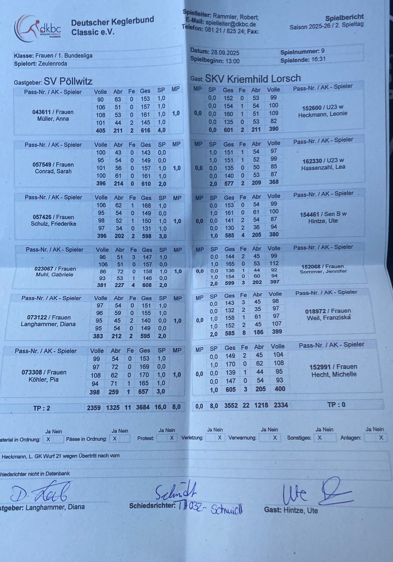 Kegel, ihre Gegnerin jedoch 608, sodass auch dieser Punkt an Pöllwitz ging. Die