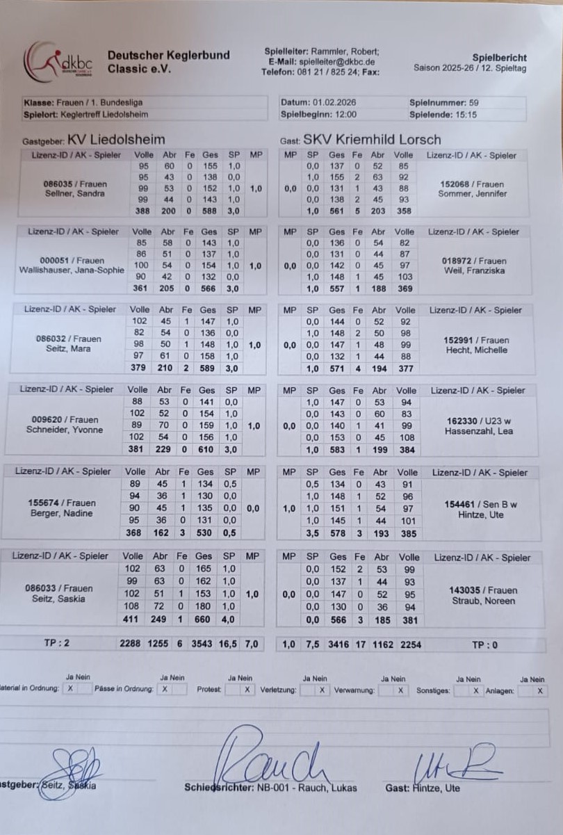Endstand 1,0 : 7,0 Punkte und 3416 : 3543 Kegel