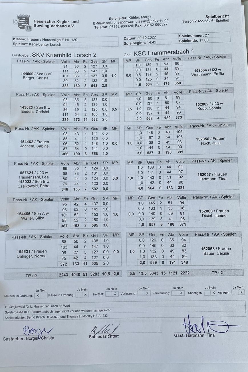 Christa Borger rief ihr Spiel sofort ab und sicherte den Lorscher Frauen den ersten Mannschaftspunkt mit 2,5:1,5 und 543 : 534. Christel Enders teilte sich den Mannschaftspunkt mit ihrer Gegenspielerin, erzielte aber hierbei ihre persönliche Bestleistung mit 562! Sabine Jochem hatte mit einer stark aufspielenden Julia Hock zu kämpfen, und musste sich leider mit 1:3 Punkten und 556 : 587 geschlagen geben.