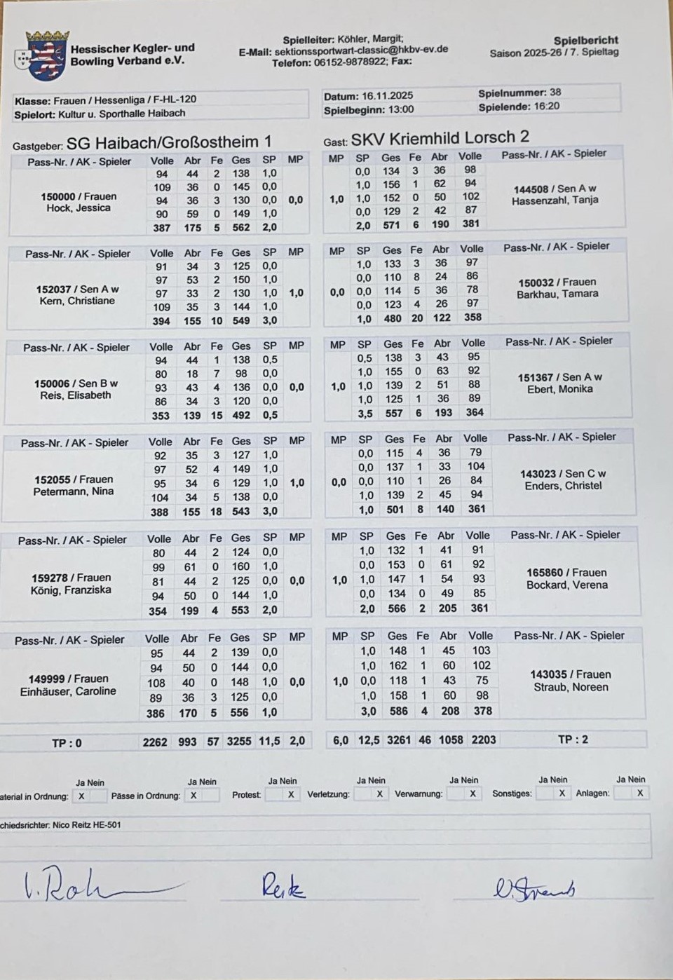 Endstand: 3261 : 3255 Kegel und 6,0 : 2,0