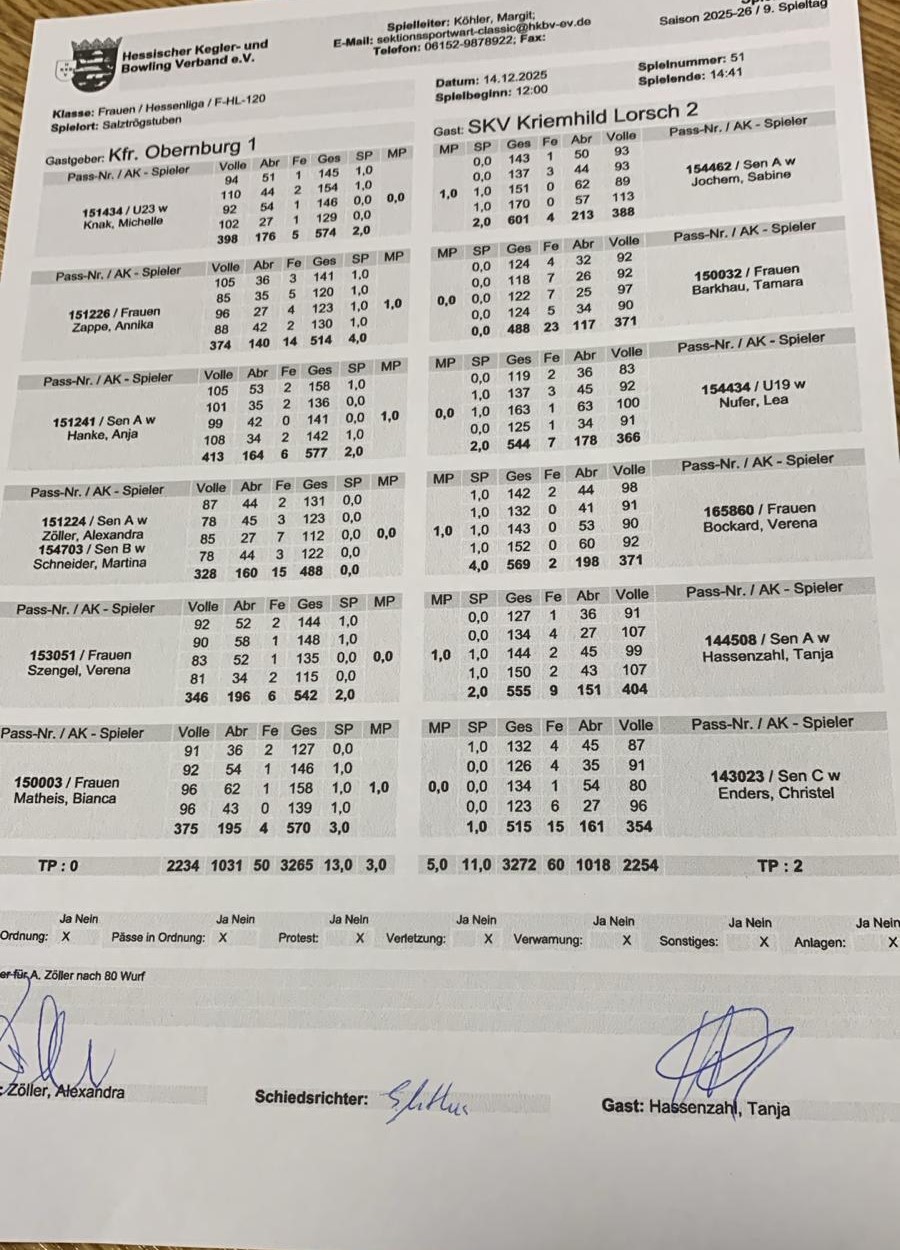 und 3272 : 3265 Sieg verabschieden wir uns in die Weihnachtspause und