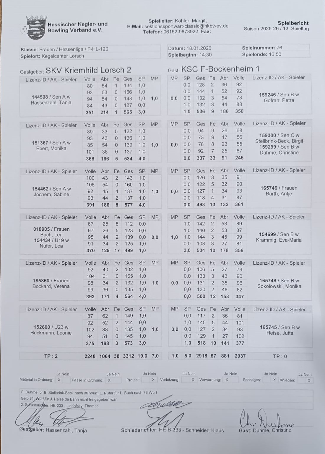 Mit 7,0 : 1,0 und 3312 : 2918 gewinnt die zweite