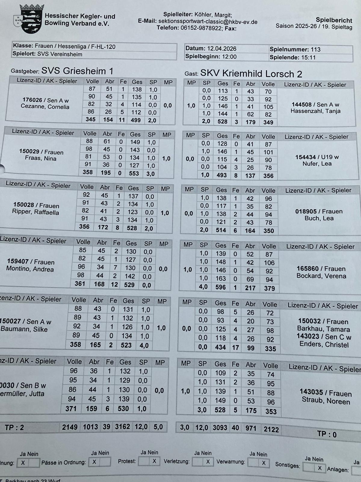 Das Spiel ging insgesamt mit 3093:3162 Kegel und 3,0 :